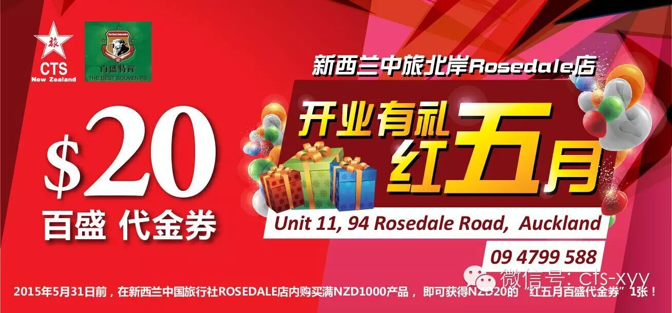 为庆祝新西兰中旅的第11家门店在北岸Rosedale Road顺利开张,为了感谢新老朋友们对新西兰中旅的一贯支持,新西兰中旅现在联合百盛特产推出新店购物送代金券活动!